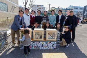3月7日に開催した「春のキャンパスコモンイベント2026」で、ベンチのフトンカゴn入れる石に、公園への願いなどのメッセージを来場者に書いてもらいました。本棚のお披露目では、学生と地域の子どもたちが一緒に除幕式も行いました。